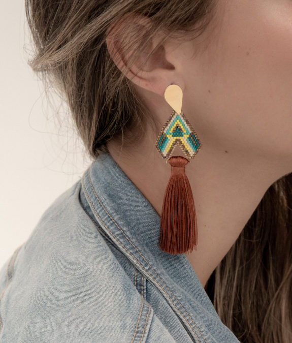 Aretes con un diseño contemporáneo, elaborado en chaquira miyuki y baño de oro 18k