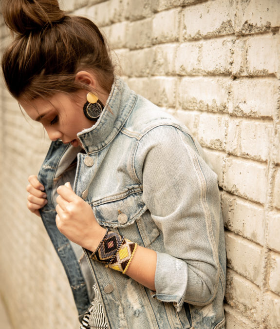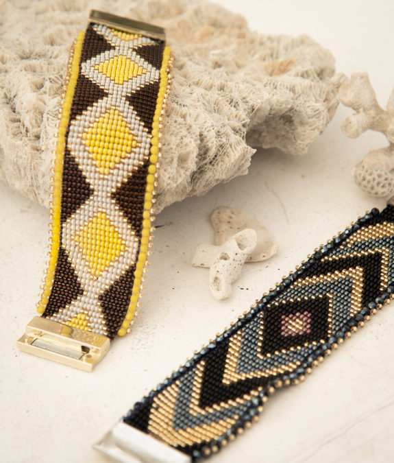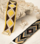 Brazalete con un diseño contemporáneo, elaborado en chaquira miyuki y baño de oro 18k. Disponible solo en color negro