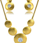 Collar y aretas  con un diseño contemporáneo, elaborado en una aleación de zinc bañado en oro 18k y cristales Dimensiones Collar: Largo:51 c.m,